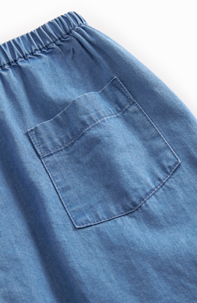 Byxor i lätt denim tyg i 100% bomull med en avslappnad passform och elastisk midja för maximal komfort. Perfekta för vardagsbruk eller till festligare tillfällen. Det mjuka bomullstyget ger en skön känsla och rörelsefrihet hela dagen.