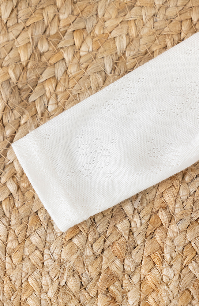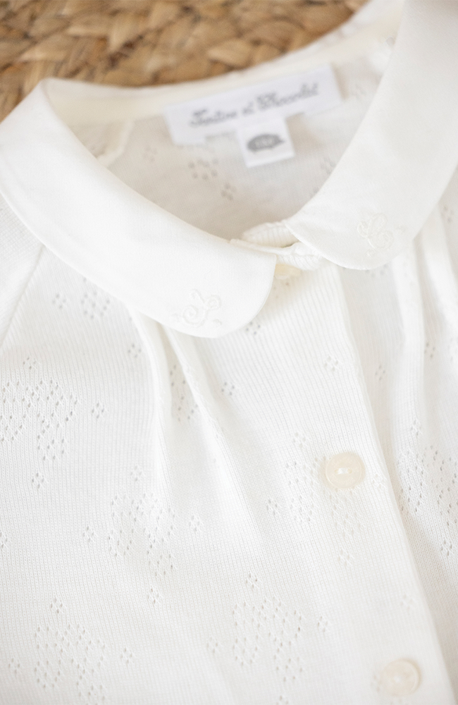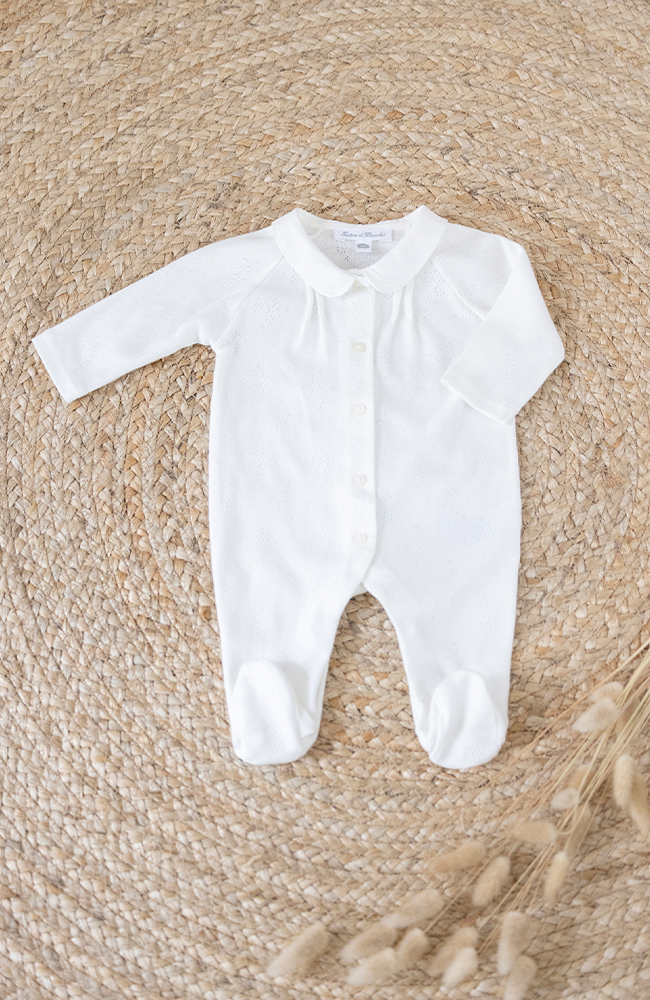 Vi förälskar oss i denna vackra onepiece i ekologisk bomull – både mjuk och bekväm för daglig användning. Den är gjord i ett fint pointelle mönster med TC-monogrammet och har en söt Peter Pan-krage som ger ett tidlöst uttryck.