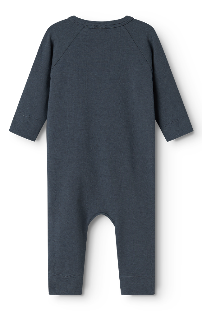 Långärmad sparkdräkt med omlottknäppning – stängs smidigt med tryckknappar och knytband från halsen ner längs ena benet.