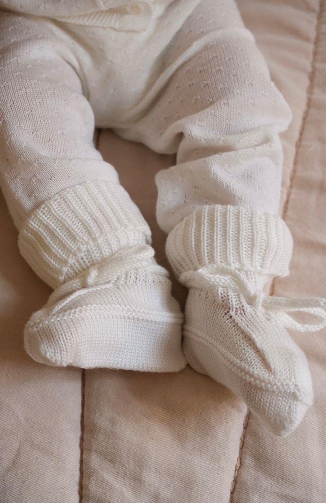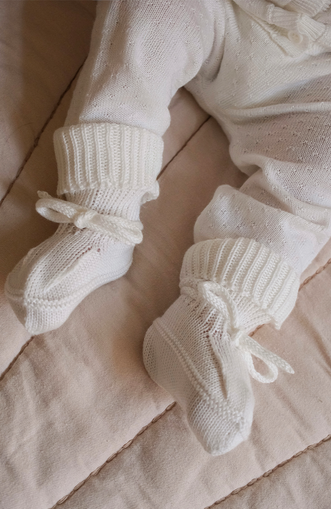Dessa babyskor är tillverkade av en mix av ekologisk bomull och modal, vilket ger en otrolig mjuk känsla. Tossorna har ribbade muddar som kan vikas och en snörning för en säker passform, vilket gör dem både praktiska och bekväma. Perfekta för att hålla små fötter varma under kyligare dagar.