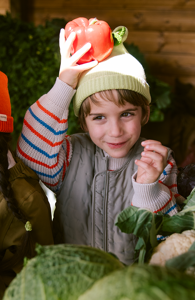 En mjuk och lekfull stickad mössa i ekologisk bomull, prydd med en charmig bladdetalj upptill. Den ribbstickade uppvikta kanten ger en bekväm passform som sitter bra utan att strama.