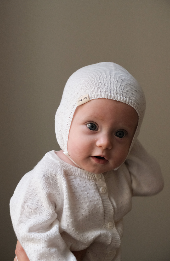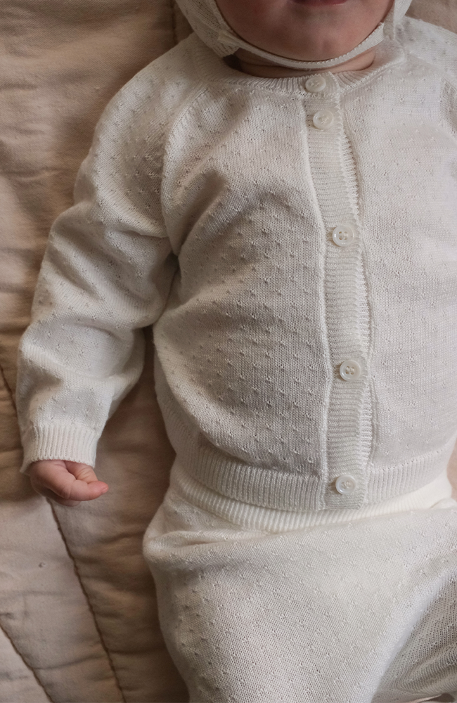 Mjukt stickad kofta i en skön blandning av ekologisk bomull och modal. Designad med ribbade kanter och knappar framtill.