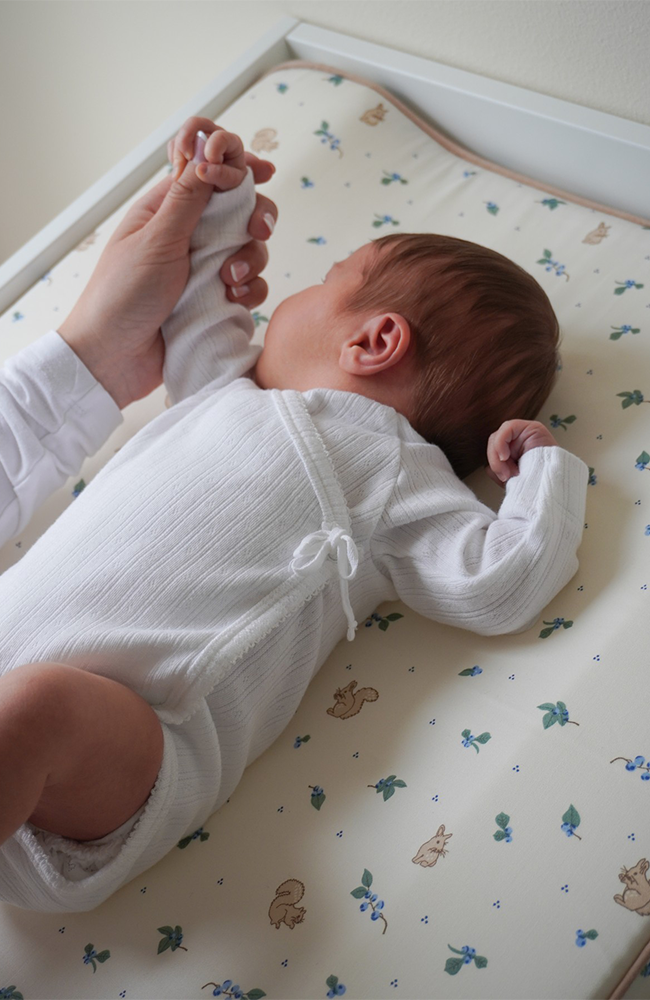 Skötbädd med skön form och höga kanter, som ger ett bra stöd för bebisen. Kudden är gjord av kallpressat skum och har ett avtagbart och tvättbart överdrag. Kudden har en praktisk smuts- och vattenavvisande beläggning, och skummet inuti är täckt av ett mjukt fodertyg för att underlätta processen att ta av och applicera överdraget vid tvätt.