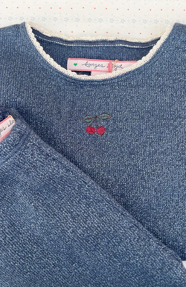 Incredibly beautiful and classic finely knitted cardigan from Konges Sløjd with embroidered cherry on the chest.