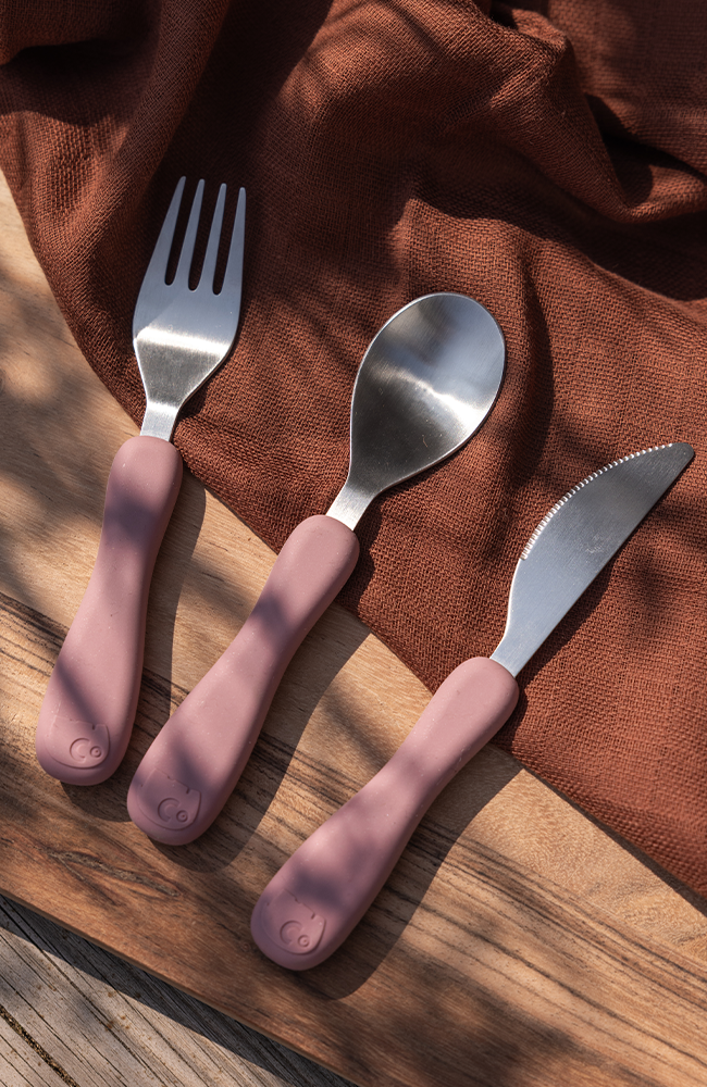Setet innehåller en kniv, gaffel och sked och är perfekt för små händer. Den ergonomiska designen gör det enklare att äta själv, och besticken är både robusta och tåliga. De tål diskmaskin och är en fin present till dop eller födelsedagar.