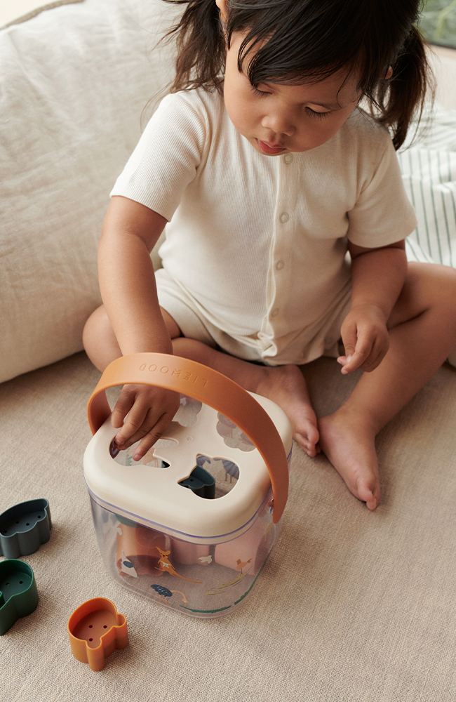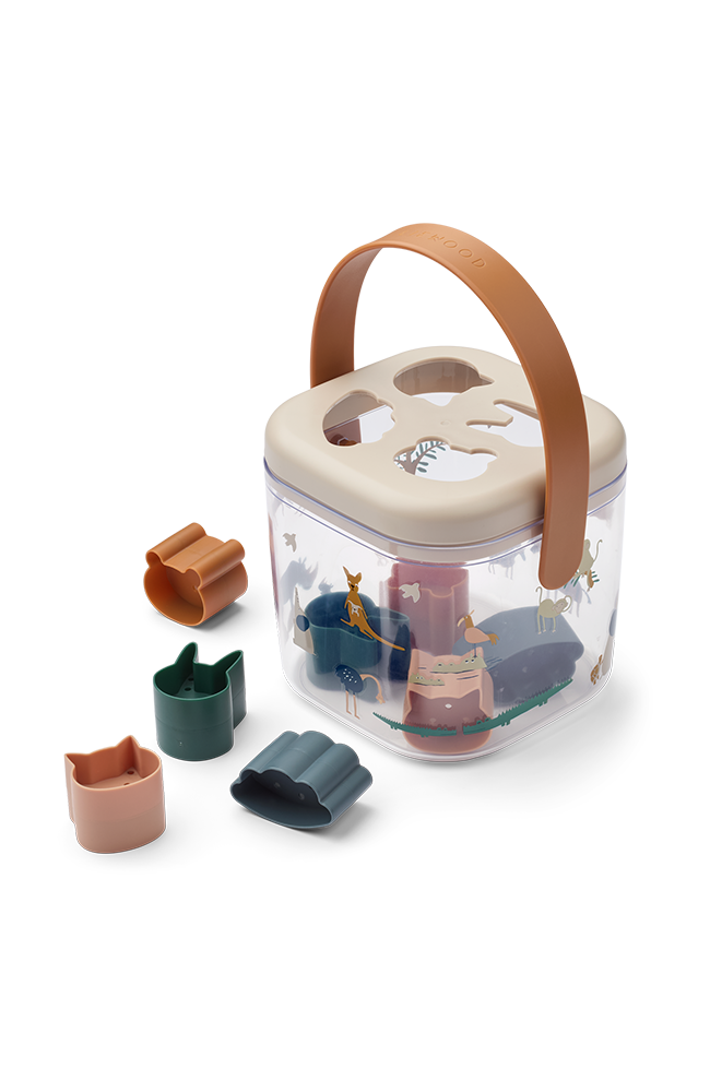 Lådan passar lika bra för lek inomhus som utomhus. Varje form har små hål och kan även användas som små silar, vilket gör leken extra rolig i sandlådan eller vid vattenlek.